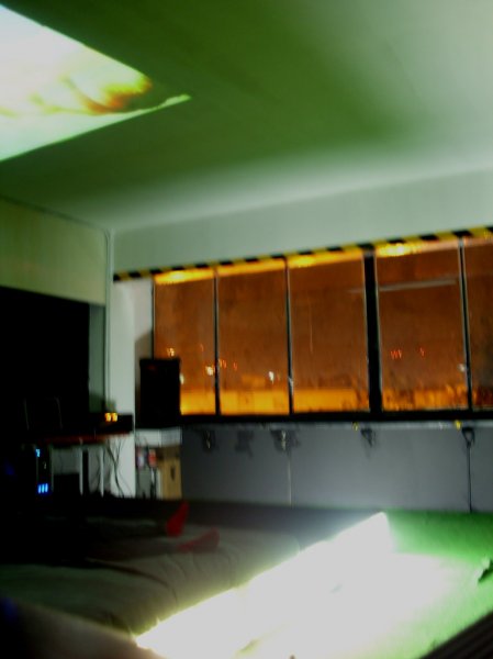 a videobeamer projecting movies on the ceiling, a full mattress-covered lightening stage, panoramic windows and plastic grass on the floor...