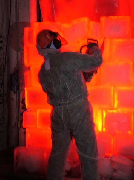 Still another moment of the performance, where the ice brick wall was cut in pieces by a motorsaw performer.